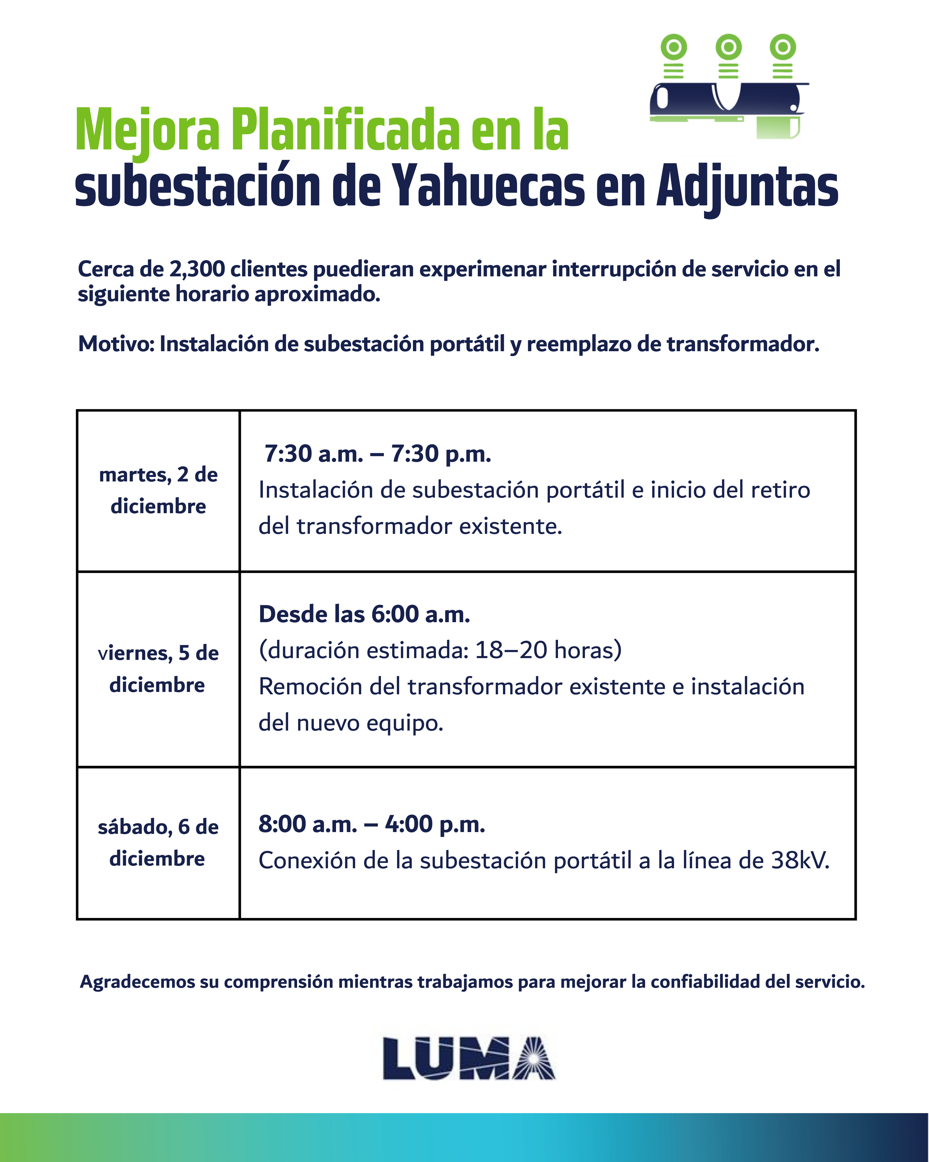 LUMA urges customers to prepare for these scheduled interruptions and assures that crews will work continuously throughout December and early January to complete the transformer replacement.